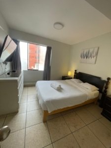 El departamento cuenta con Sala con Sofá cama, Comedor para 4 personas, 1 dormitorio con closet, Kichenette con cocina encimera a gas, microondas, Refrigeradora, vajilla y utensilios de cocina,01 Baño completo