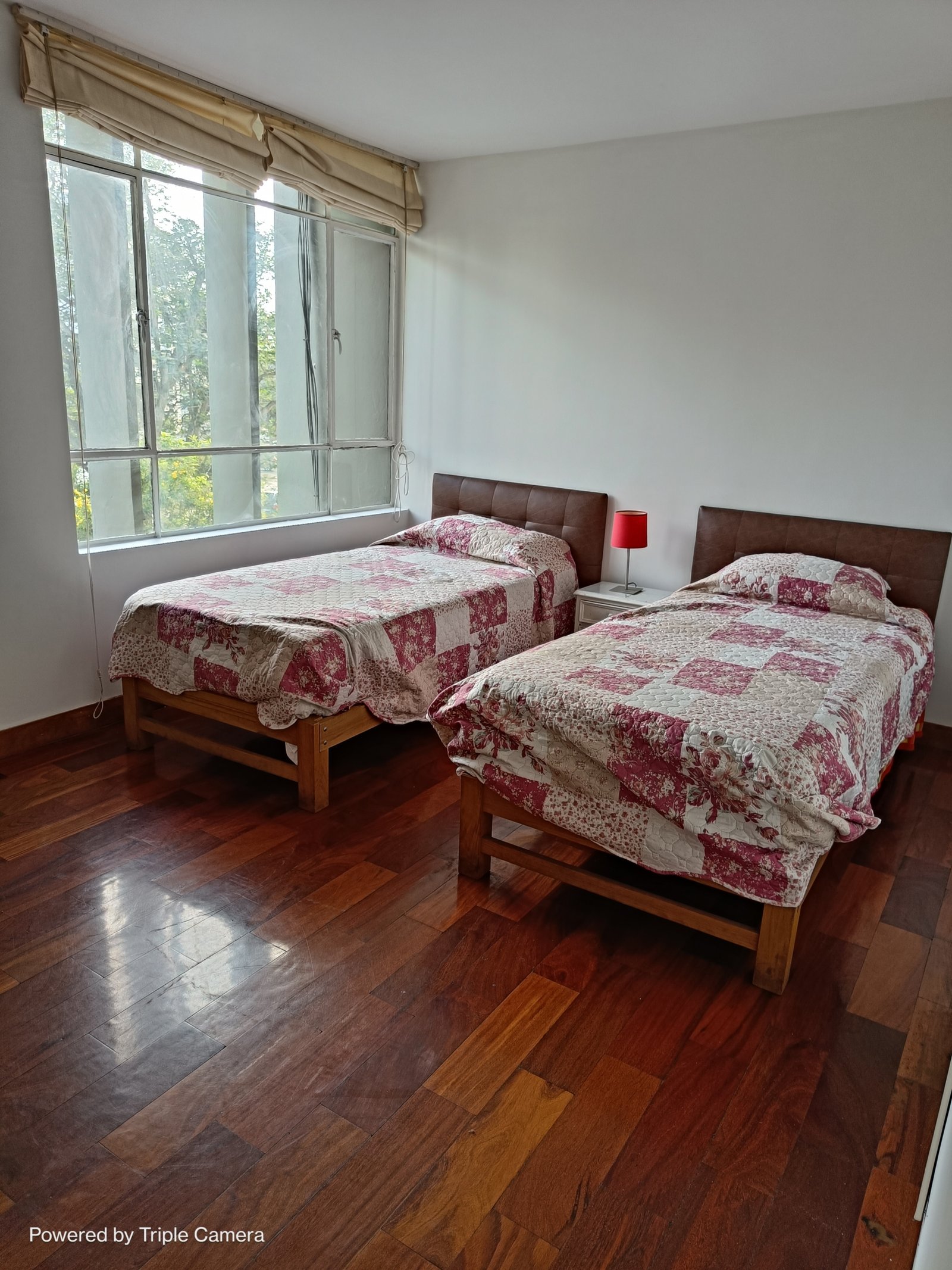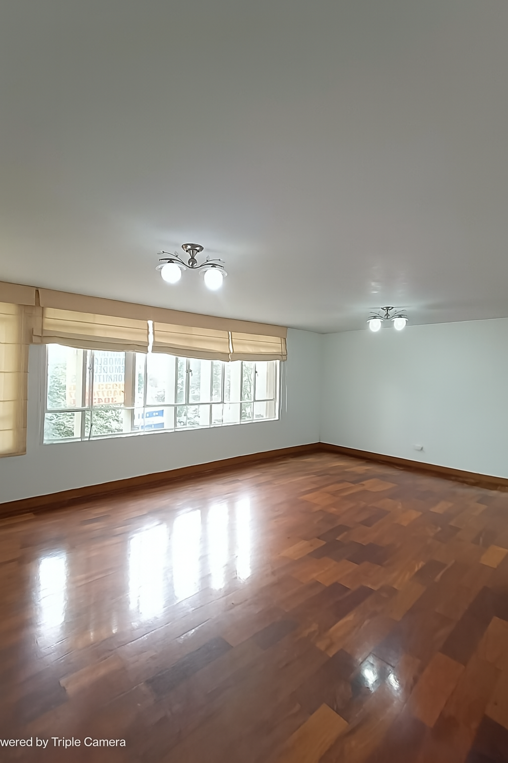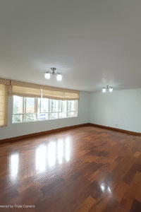 Se aprecia la sala-comedor con piso de parquetón recién pulido, grandes ventanales con persianas romanas beige, y una distribución rectangular que permite múltiples configuraciones de mobiliario.🔹 Ambiente neutro y profesional